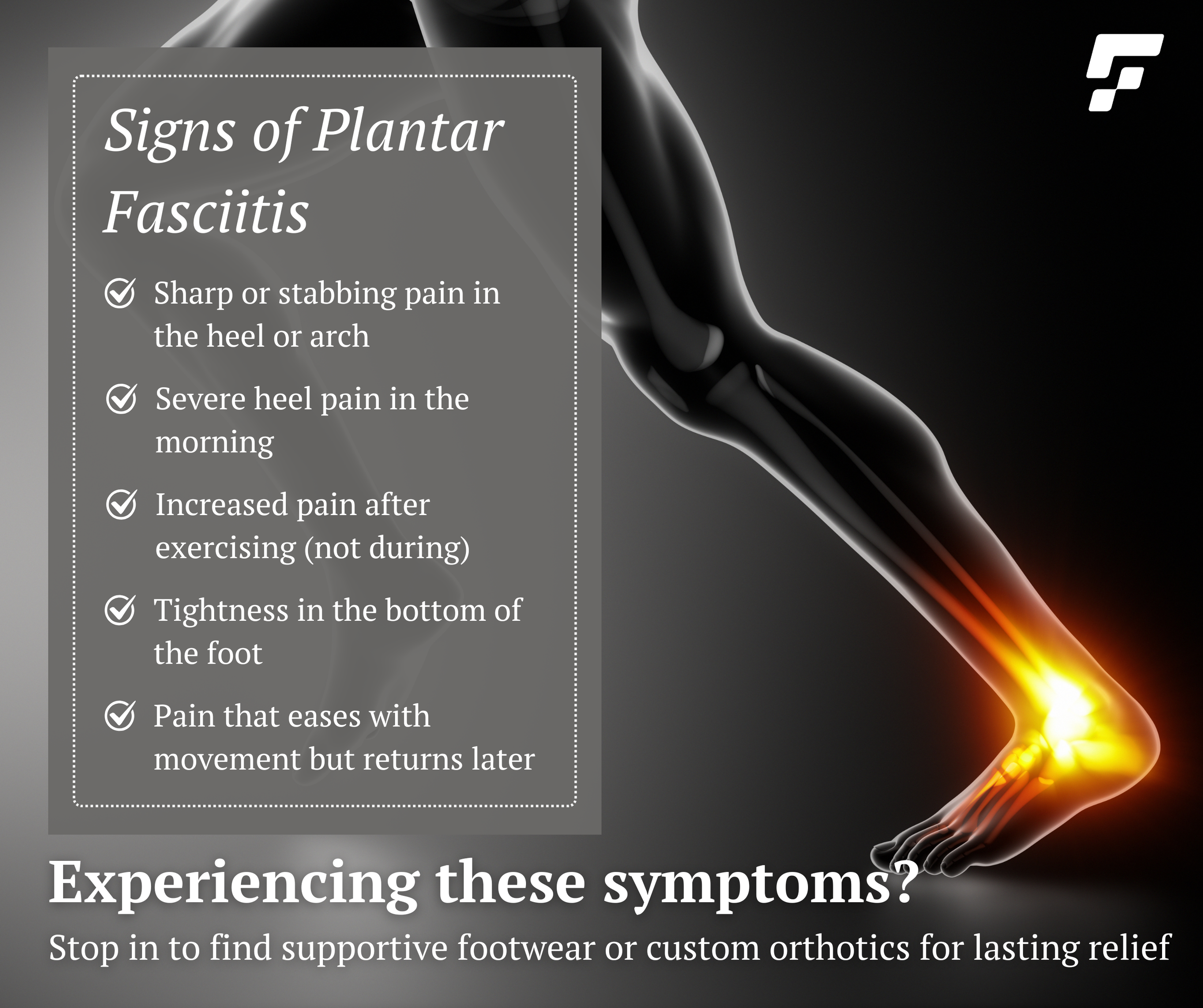 Foot pain solutions for common conditions such as plantar fasciitis, heel spurs, overpronation, metatarsalgia, etc.